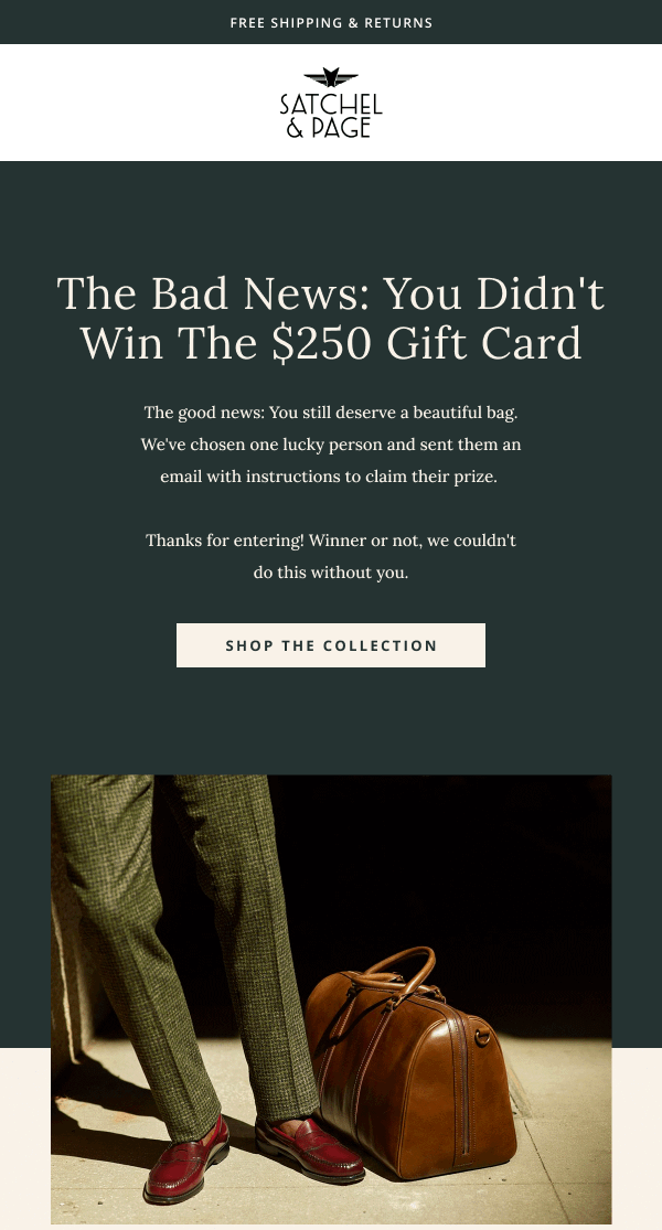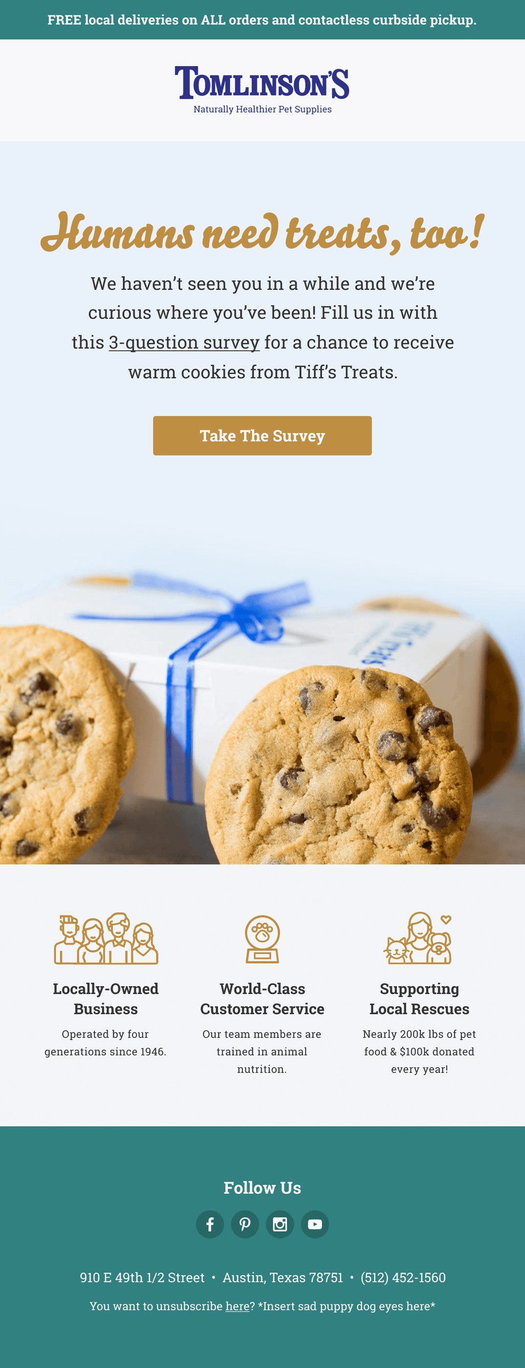 These emails try to grab the attention and re-engage indifferent subscribers. We shared a few examples in our menu of email ideas earlier in the article—in case you skipped past. ;)