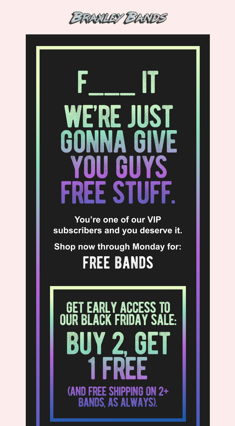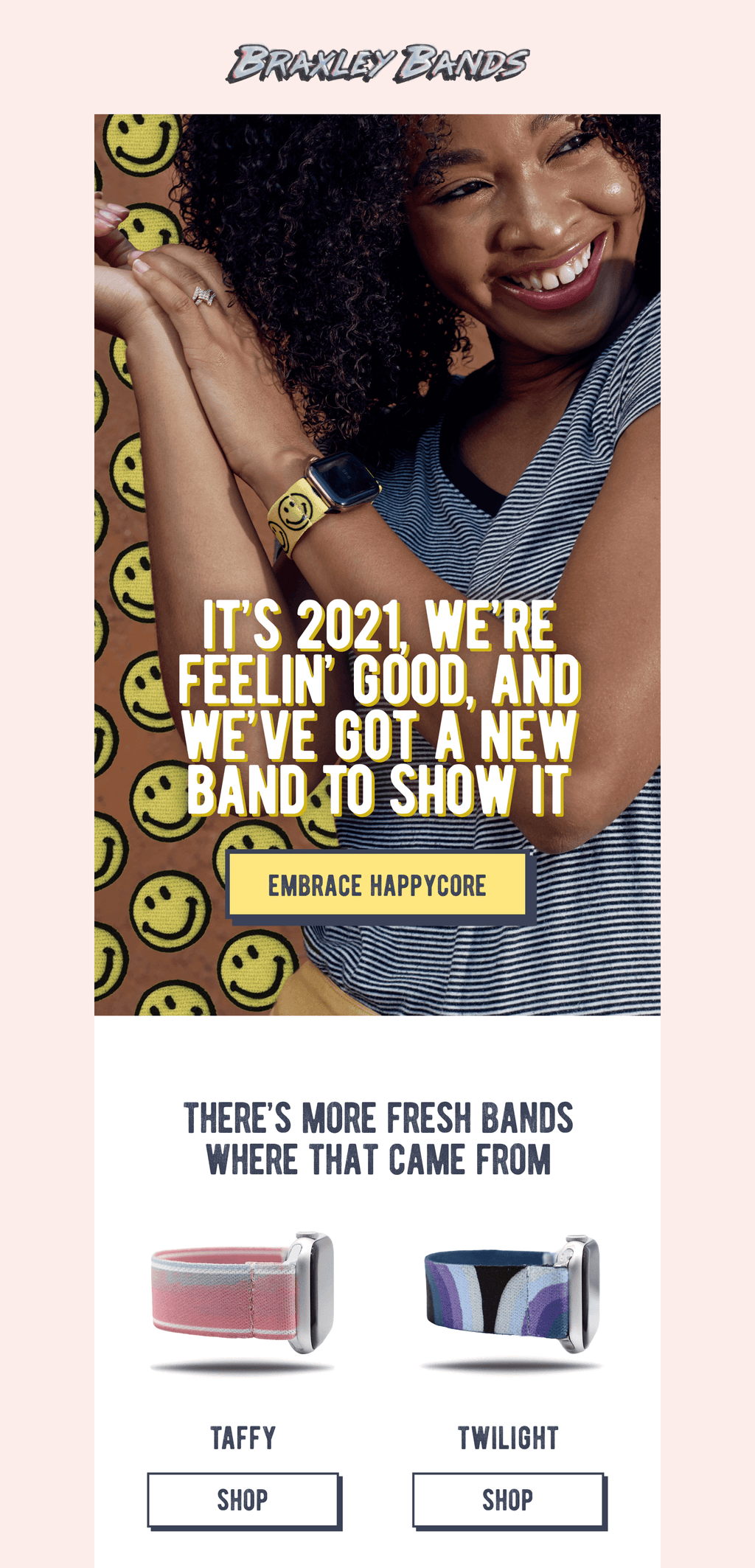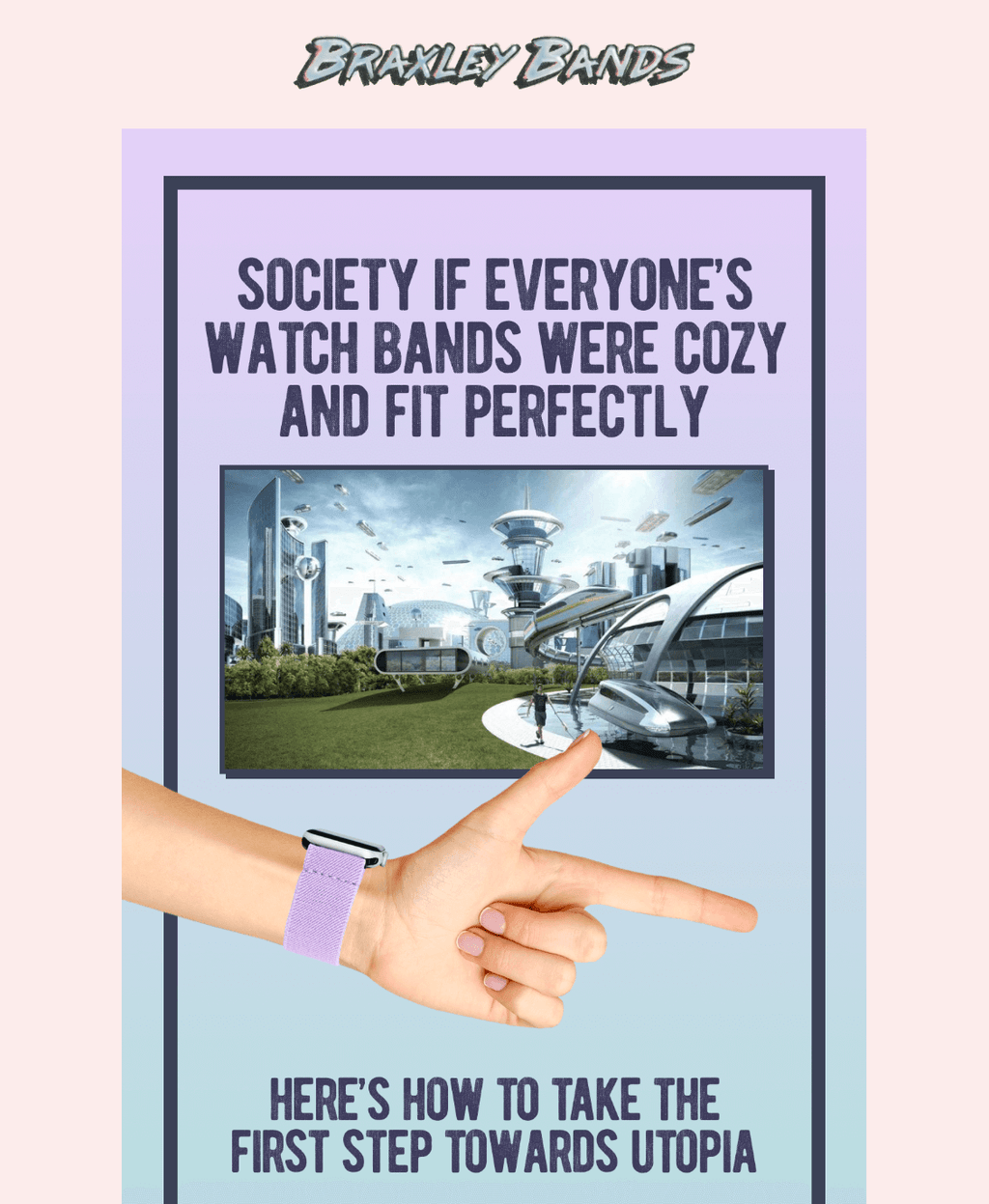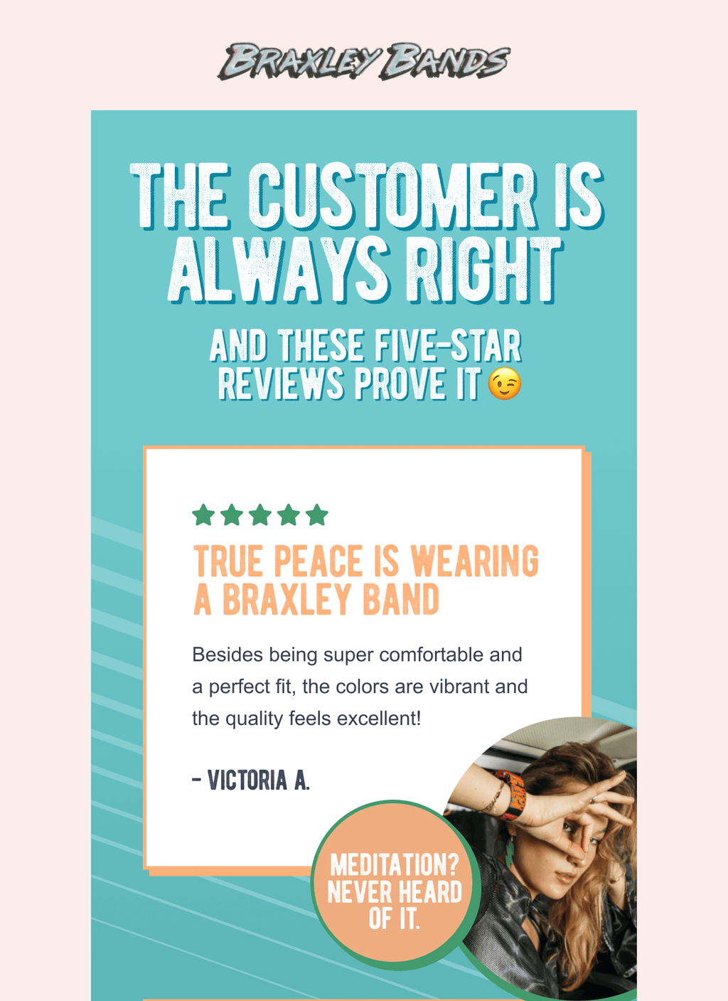 You can tie reviews and UGC in with other email campaigns and flows, or you can send an email that’s entirely dedicated to showing off your awesome reviews. Braxley Bands did this, using elements of humor to drive the point that they have a lot of satisfied customers.