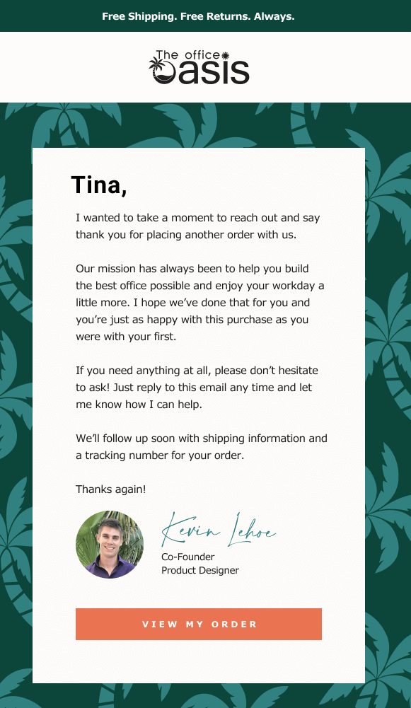 The first email we recommend is just a plain-text email. Essentially, an email with no design elements, so it doesn’t feel like the customer is being sold to. Instead, it feels like someone from the brand is personally reaching out to be helpful.