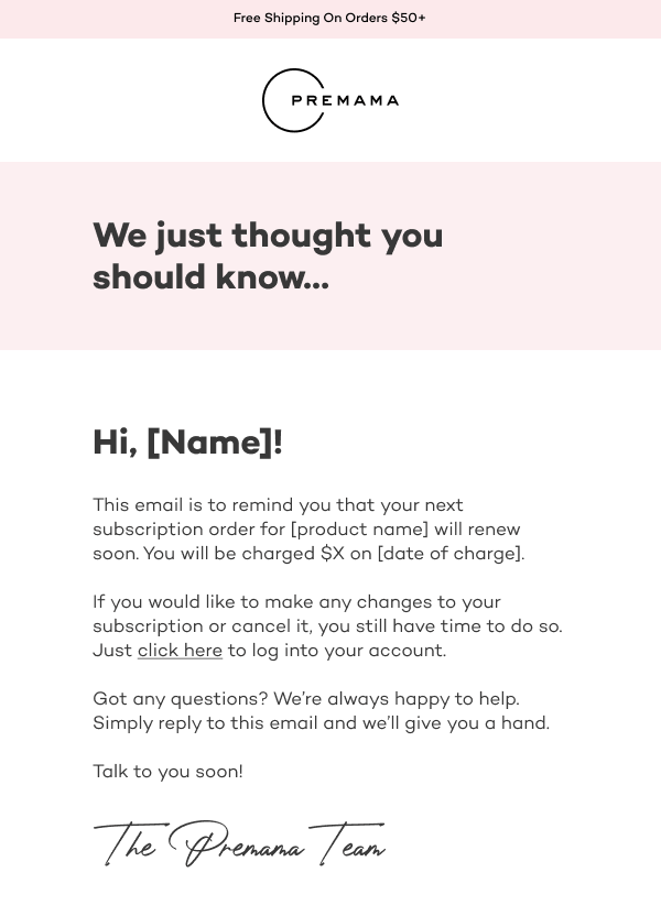 Customers don’t want to be surprised by a monthly charge on their credit card, so keep them updated with upcoming charges, cancellations, renewals, and any other important information.