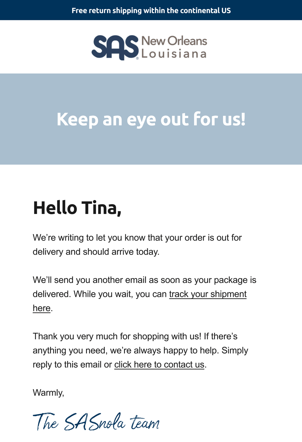Some brands will only send order confirmation emails, but it’s best practice to keep customers updated throughout the entire shipping process. This builds trust and leads to a stronger brand-to-consumer relationship.