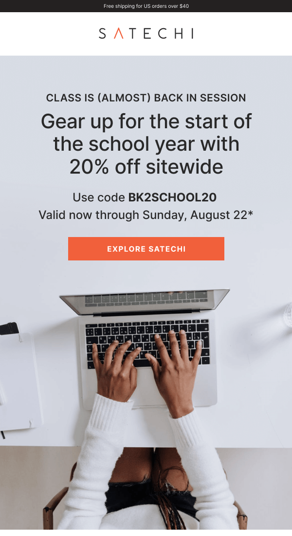 For example, using the back-to-school season in August, Satechi created a 20% off sitewide sale to promote products that are relevant to students, like a laptop bag, keyboard, and charger.