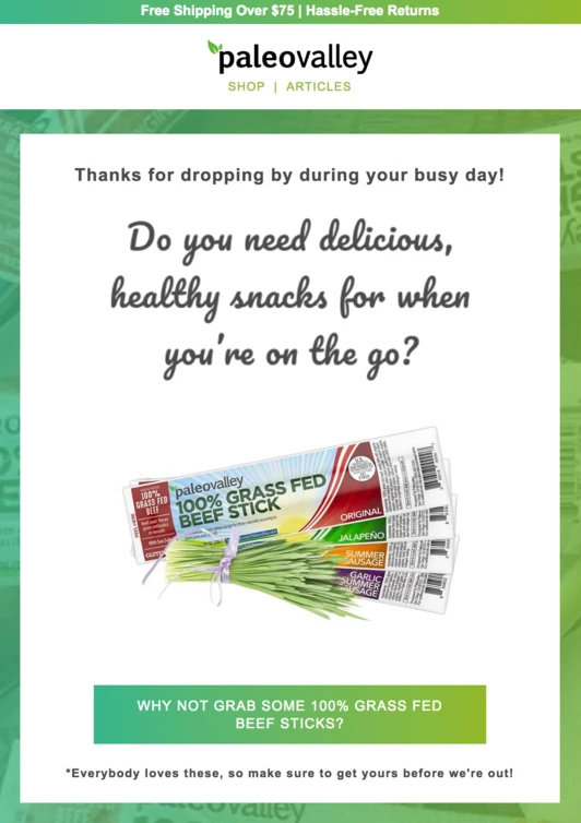 Take Paleovalley, for example; after recommending its product, they use the next content block in their email to share a customer testimonial and review to help drive the sale.
